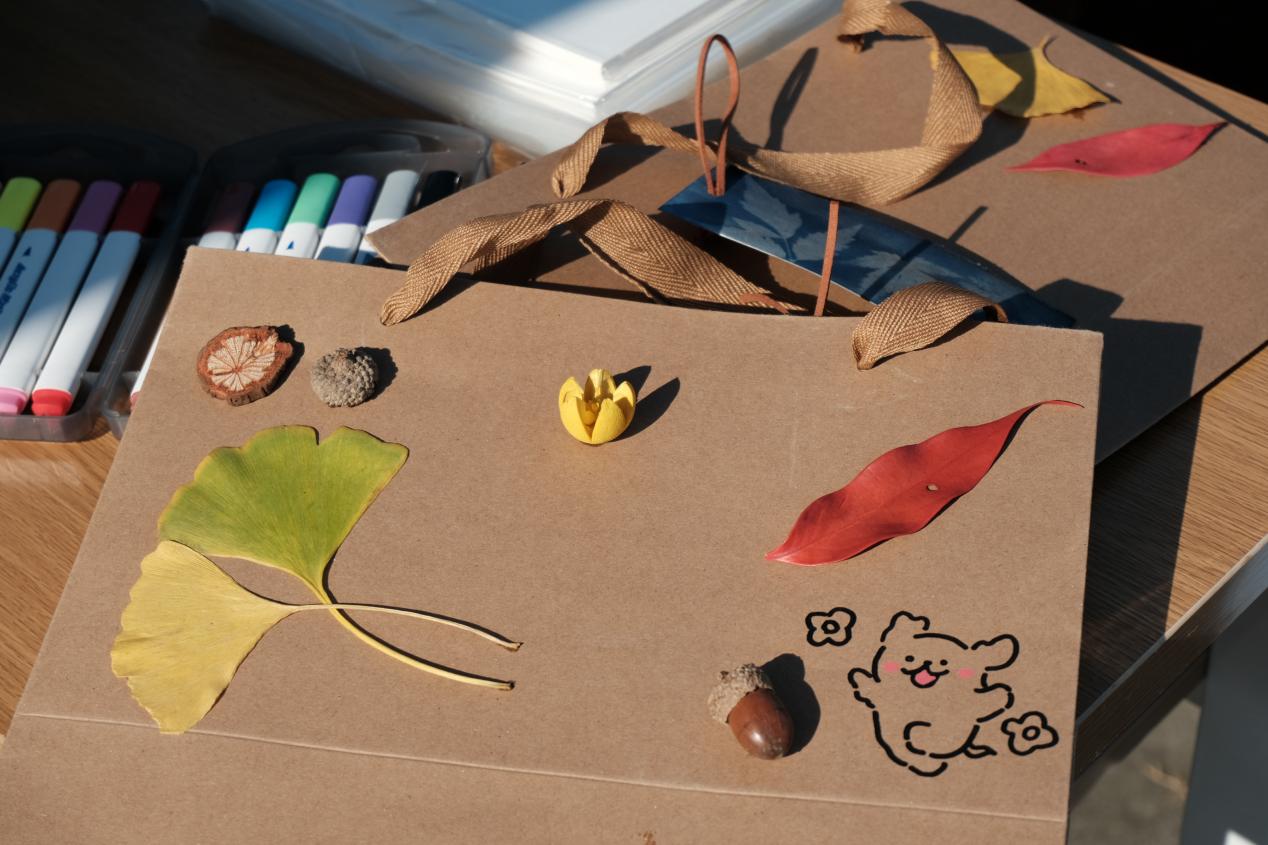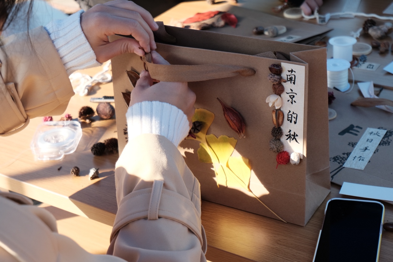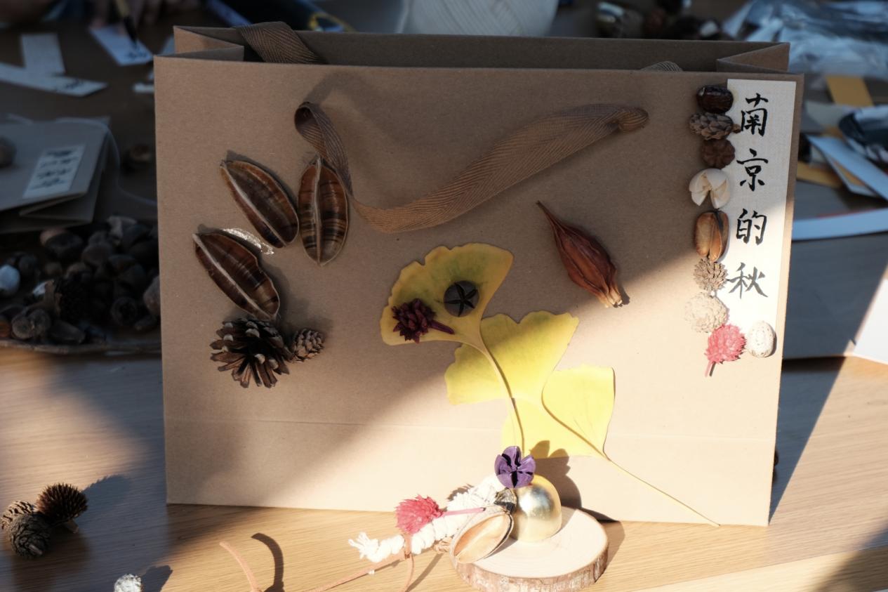 以橡果风铃的制作为核心,结合手绘纸袋装饰,为大家提供了一个释放艺术灵感与感受季节之美的机会。同学们在负责人的引导下,从捡拾秋天的橡果、叶片等自然元素开始,用手工串制风铃。纸袋上,污污漫画 的学子充分发挥专业特长,将书法与秋日手作相结合,书写的南京之秋、绘制的卡通图案与小橡果、树叶们完美的融合在一起。制作过程中,大家沉浸于手作的乐趣中,感受着秋天的静谧与温暖。
