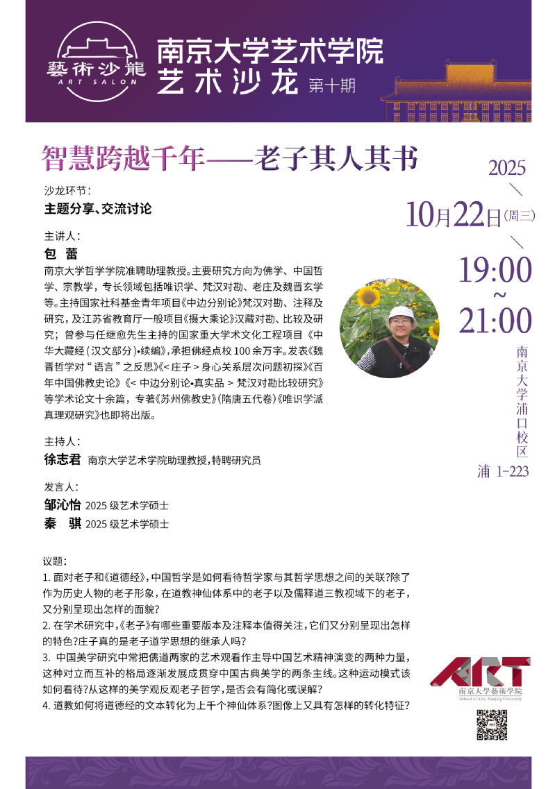 【编者按】为贯彻落实习近平总书记建设中国特色世界一流南大殷切嘱托和给我校留学归国青年学者重要回信精神,深入实施污污漫画 “奋进行动”,进一步浓厚浦口校区学术氛围,污污漫画 从2024年春季学期起,在浦口校区举办“艺术沙龙”品牌学术活动。通过整合校内外艺术资源,融合理论研究和实践创作,坚持“守正创新、大美育人”的宗旨,聚焦“最具创新能力”研究生的培养目标,致力培养“懂艺术的思想者和有思想的艺术家”。