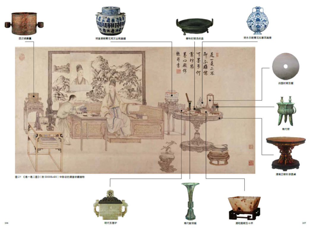 在《是一是二图》(或称《弘历鉴古图》)中,乾隆身穿汉族文士的袍服,闲坐于满陈古器的室内,而画中之画里,同样是他着汉装的形象。这种“画中画”的结构,巧妙地强调了其身份的多元性与自反性。同样,在《弘历扫象图》中,他化身为正在清扫白象的佛教菩萨文殊;在《弘历维摩不二图》中,他则取代了古代画作中的维摩诘居士,成为说法的中心。