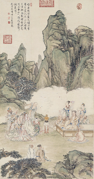 右图 清 丁观鹏、张宗苍《弘历维摩不二图》轴 纸本设色 纵118厘米,横61.2厘米 故宫博物院