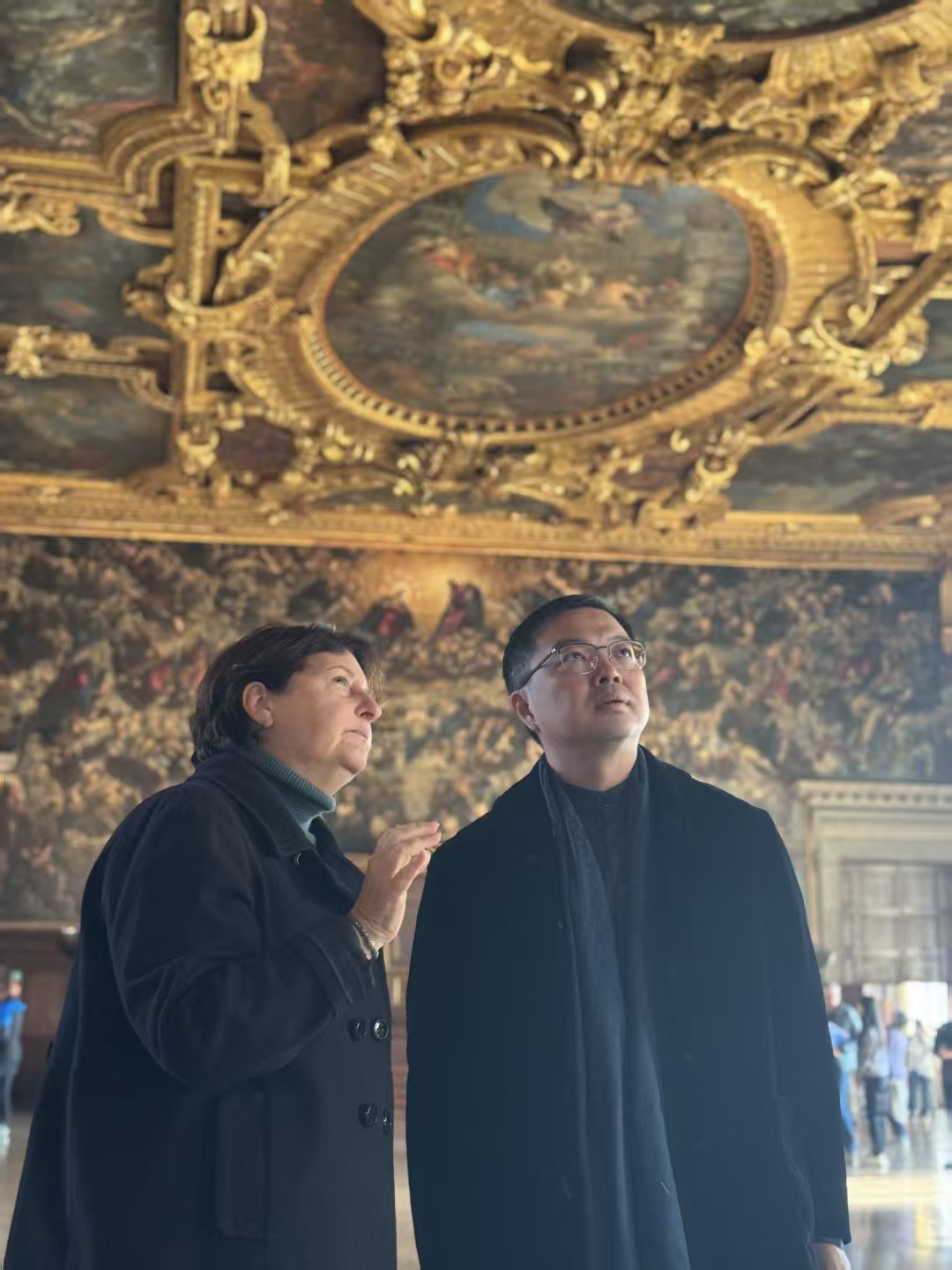 尚荣副院长在访谈中分享了威尼斯与中国在艺术史上的深厚渊源,并围绕“开放融合的城市气质对文化创新的影响”以及“中意文化艺术交流的未来愿景”等议题,与馆方深入探讨。他特别提及吴为山先生创作的《超越时空的对话——达芬奇与齐白石》雕塑现立于意大利达芬奇博物馆,以及“威尼斯之狮”可能与中国铜矿及艺术传统的潜在关联,强调“威尼斯本身就是一个催生跨文化对话的奇妙场域”。双方一致认为,在全球文化格局深刻变化的今天,高校与博物馆应携手搭建更具活力的国际合作平台。