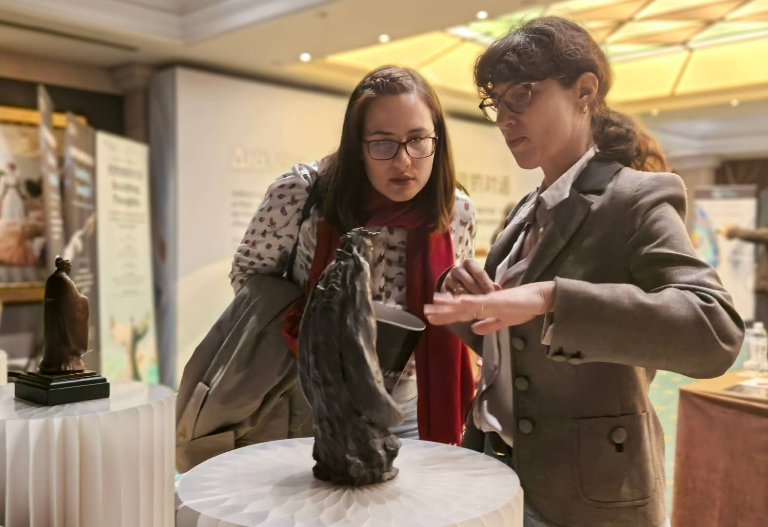 新华报业传媒集团副总编辑高坡在致辞中指出,中国和希腊同为文明古国,友谊源远流长,历久弥坚。本次展览展出的九件来自中国江苏的当代雕塑作品,是从全省多位优秀艺术家的投稿中精心遴选而出。其中,由尚荣副院长创作的两件作品《共携》与《艺舟扬四海》备受瞩目。《共携》 作为活动的象征符号,在启动仪式上由中希双方代表共同展示。作品巧妙地将象征中国商周礼乐文明的青铜与象征古希腊传统的大理石元素融为一体,正面呈现展翅的和平鸽,背面化为两只掌心相对的手,生动传递了“理解、尊重、合作”的深意。《艺舟扬四海》 则以一组共乘扁舟、演绎“琴棋书画”的中国传统文人形象,隐喻中华文明如舟,驶向世界进行对话。