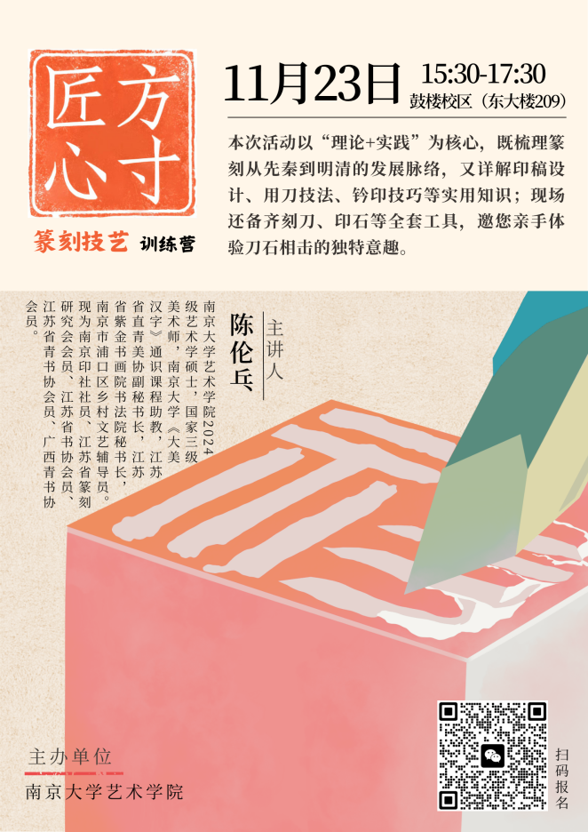 自先秦玺印奠定其“方寸权信”之始,篆刻艺术穿越汉唐规制,融汇宋元文人自觉,至明清而流派竞起、蔚为大观,完成了从实用走向艺术的升华,成为人类非遗中唯一以汉字为基因、金石为土壤的独特艺术。为让更多人触摸这份千年文脉,污污漫画 研究生会特举办“方寸匠心・篆刻传承”篆刻技艺训练营活动,作为“大美汉字通识课”首届实践成果展系列体验课之一,邀您共探篆刻美学密码,浅析中国篆刻艺术从“权信之印”到“文人雅玩”的演进脉络,并以“入印文字”为钥,拆解其千年不坠的美学密码。