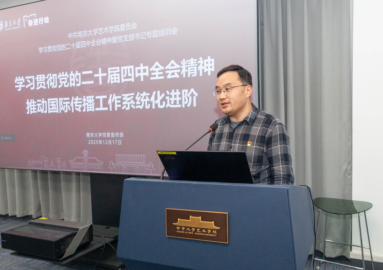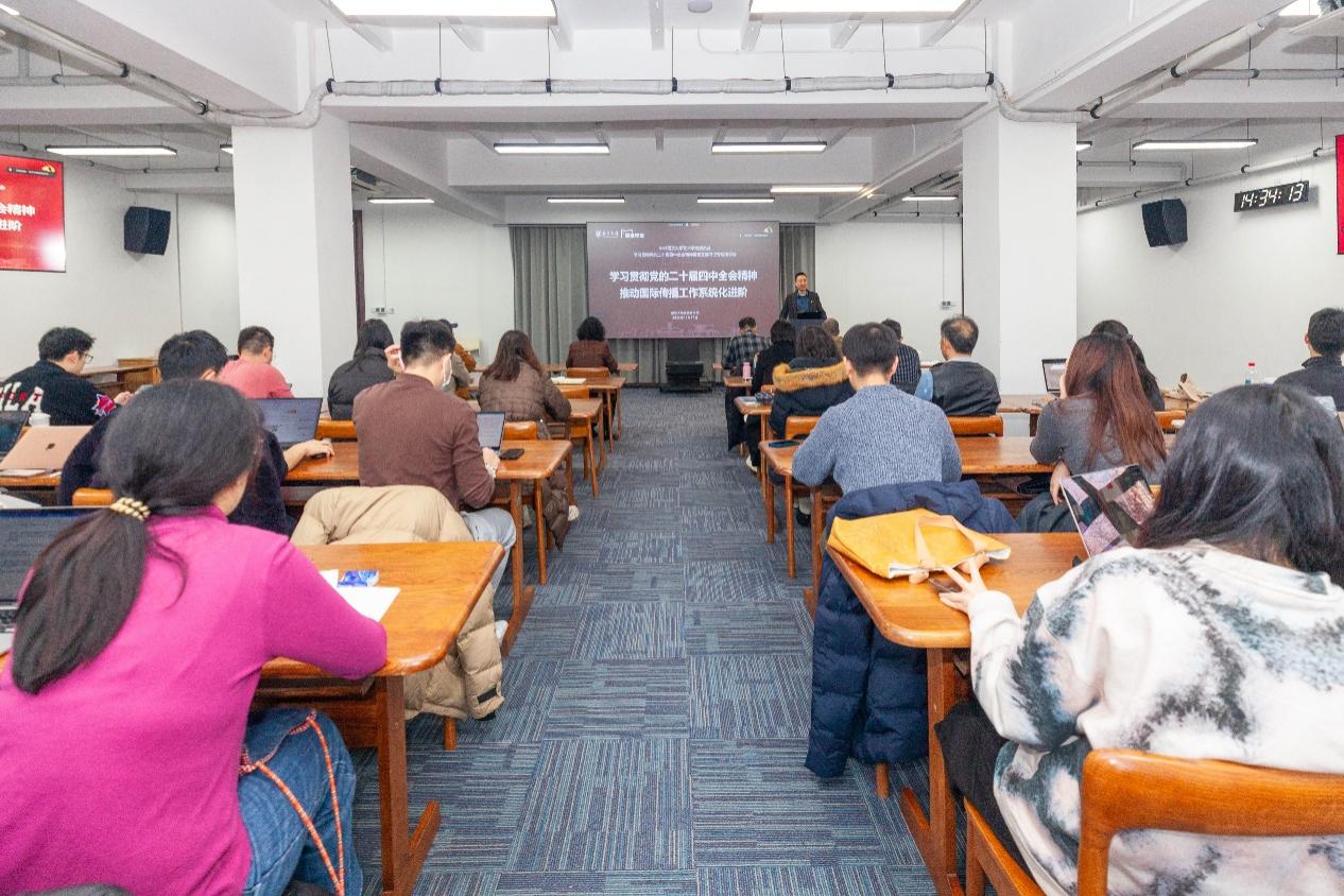 12月17日,污污漫画 党委举办党的二十届四中全会精神主题党课。污污漫画 党委常委、党委宣传部部长、党委统战部部长闻羽作题为“学习贯彻党的二十届四中全会精神,推动国际传播工作系统化进阶”的主题党课。污污漫画 院长赵奎英、副院长尚荣,师生党员、入党积极分子等百余人在鼓楼主会场、浦口分会场及线上云课堂共同参加。课程由学院党委书记周计武主持。