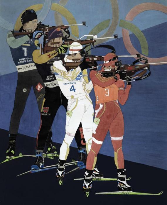 这件作品描绘的是北京冬奥会中的一项冬季运动——冬季两项,这件项目不仅需要运动者有前期高超的速度,也要后期射击时的高度精准,因此这件作品对于运动员的要求极高,我对这项运动很感兴趣,因此收集了很多资料来创作这件作品,因为这项运动是一项青年人的运动,我选择使用更为青春洋溢的色彩来描绘这件作品。用较为单纯、明丽的色彩展现青年运动员的飒爽英姿。因为这件作品符合国际双年展的主题,也展现了国家体育运动的高超实力和综合国力,因此侥幸获得了较为不错的成绩。这件作品先后被被《人民日报》副刊、《美术》杂志以及央视新闻频道报道。