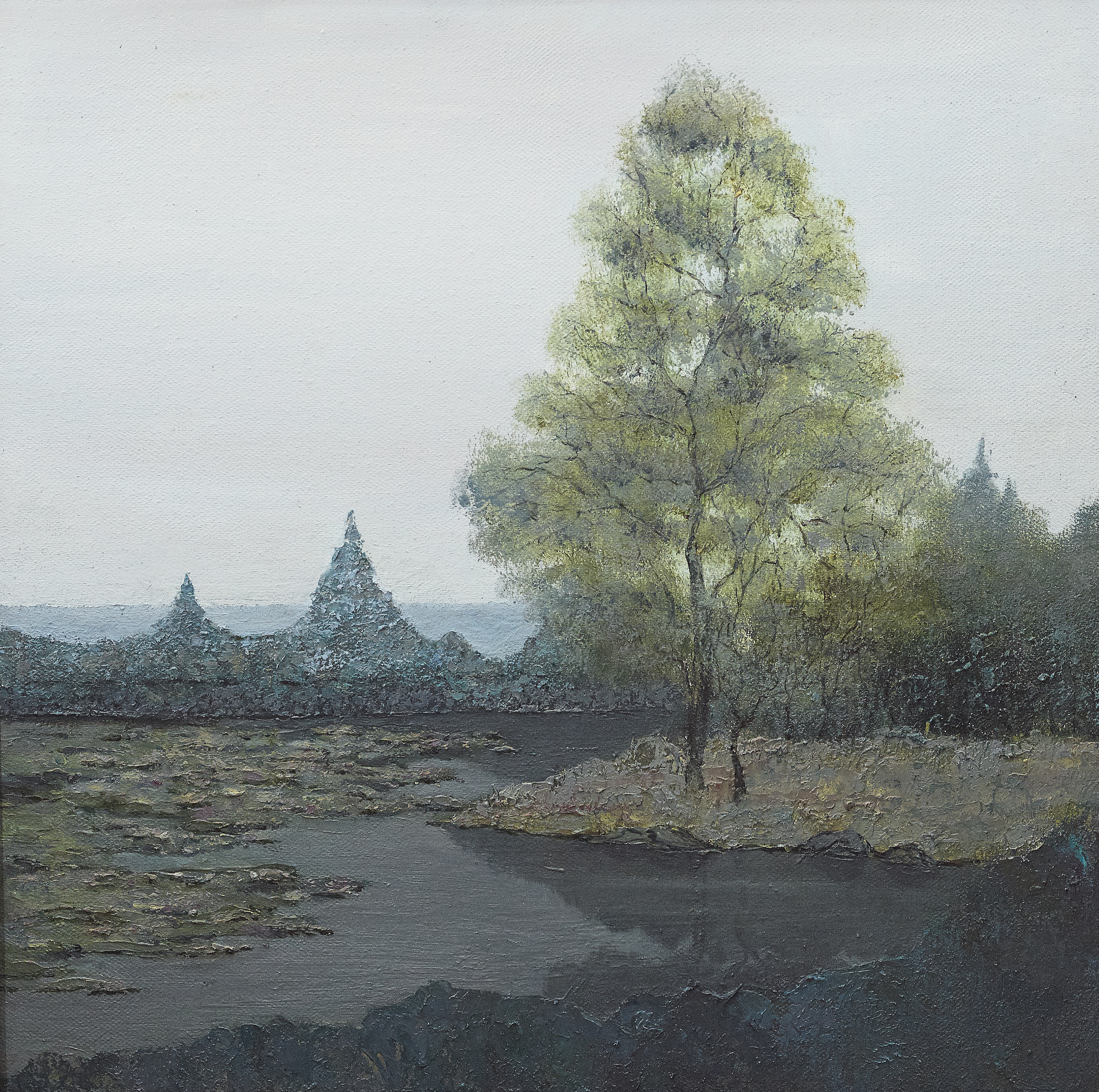 这幅画色调淡雅湖中一棵树笔直挺拔,给人肃穆之感,远处的山峦若隐若现作品立足于乡村之景,从身边的寻常景色中发现内在的美好。
