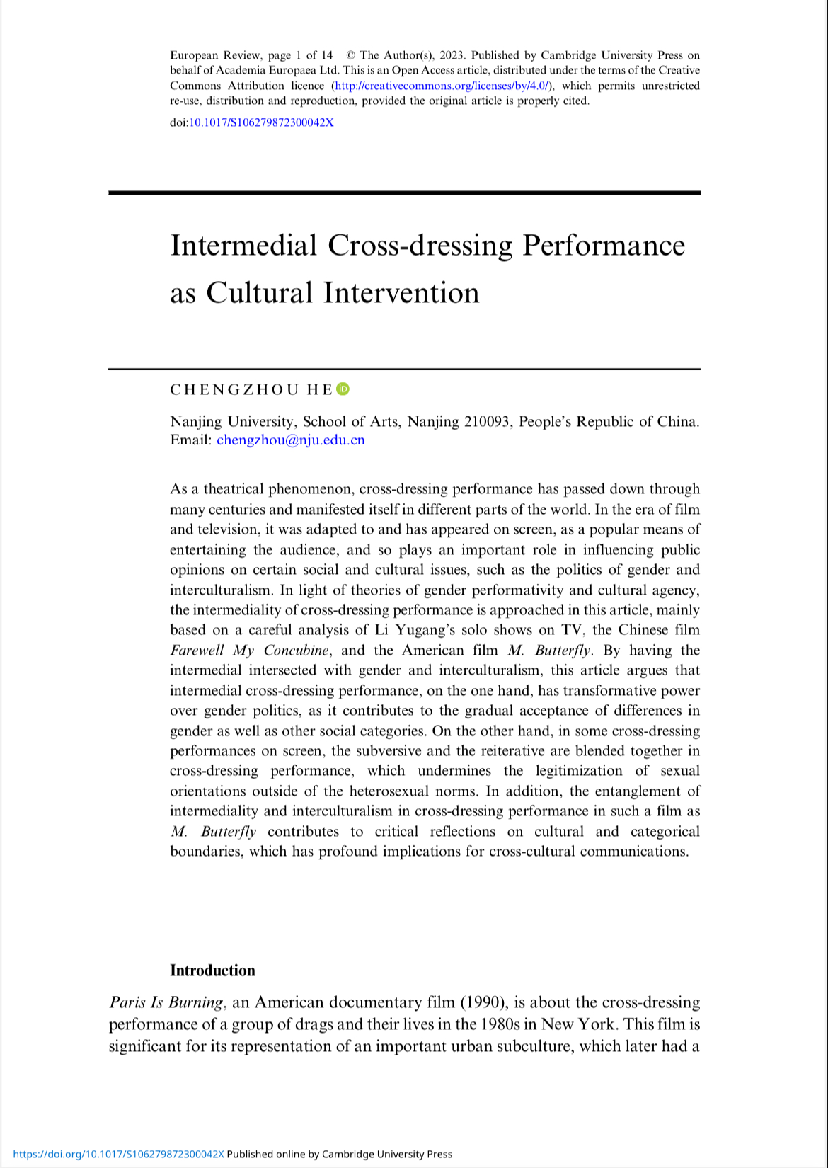 EUROPEAN REVIEW(《欧洲评论》,SSCI收录期刊)是欧洲科学院院刊,2023年10月推出跨媒介研究专辑,由我校何成洲教授和瑞典学者Jorgen Bruhn教授主编,发表10篇论文,作者来自中国、英国、丹麦、瑞典等国家。