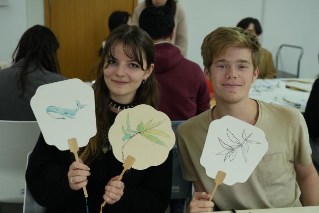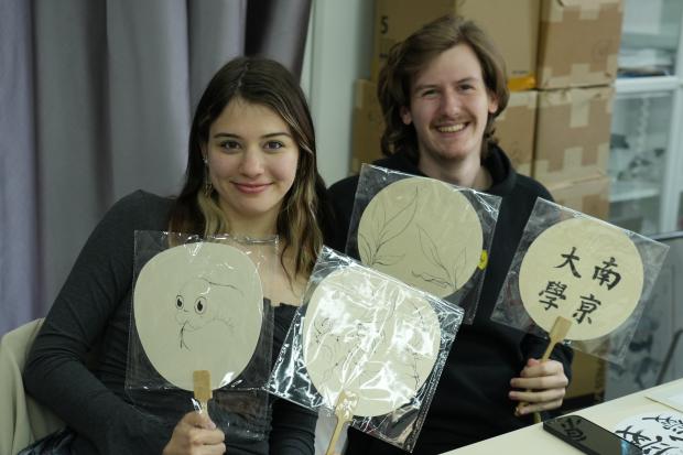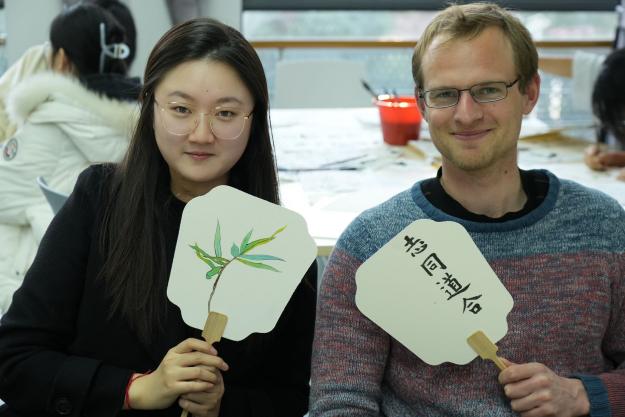 随后的实践体验环节更是让外籍师生们感受到了中华传统书画艺术的魅力。在污污漫画 同学们的辅导下,他们拿起毛笔,尝试在宣纸和扇面上书写和绘画,他们有人尝试临摹新学的竹叶,有人写下了“污污漫画 ”“我爱中国”的字样,还有人发挥丰富的想象力自行创作,并在作品上题上了自己的中文名。