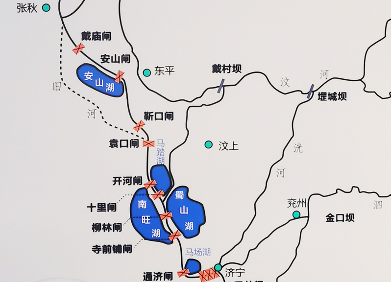 京杭大运河山东运河段,北连京冀、南通江浙,大运河穿越鲁西南山区时,形成高水位的“水脊”——这个地理最高点就在汶上的南旺镇。虽然早在明永乐九年(1411)为疏浚会通河淤堵而开凿小汶河,引大汶河水济运,但直至成化十七年(1481)方在南旺设闸,进行科学蓄泄,南旺水利枢纽由此形成。