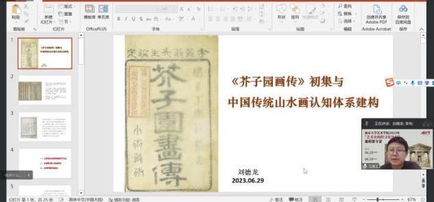 在专题讲座中,陈静副教授从艺术的媒介、艺术的传播、艺术作为传播的工具载体和方式以及跨媒介艺术与艺术的跨媒介传播四个方面,讨论了人工智能时代艺术的传播与作为媒介的艺术问题。王咏副教授在讲座中比较了生活世界中的非物质文化与现代知识形态中的非物质文化遗产观点,从认识论角度讨论了非物质文化遗产知识形态的变化,并在比较过程中反思现代认知范式对学术研究本身的影响;刘德龙副教授通过对《芥子园画传》的分析,指出《芥子园画传》初集的深刻内涵与价值,并对其在当代山水画学习与研究的意义与价值作出了探讨。
