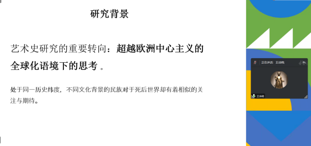 在艺术史专题分论坛中,安萍萍老师以著名画家周思聪为例,讨论了女性画家在绘画中的自我表现以及独特的女性绘画风格等内容。李茜老师从跨文化视野比较班德曼剧团巡演与梅兰芳,讨论了现代通信和远洋航行时代剧场公共空间问题。王诗晓老师以汉代宴饮乐舞墓室壁画与古罗马“乐师与哭灵者”石棺画比较为例,说明艺术史研究超越欧洲中心主义的全球化语境研究转向。李赵雪老师以文人画概念的生成与发展,作为主线来探讨世界艺术史中文人画的概念生成与接受历史,认为文人概念选择的所有人是中国本人而不是他者。