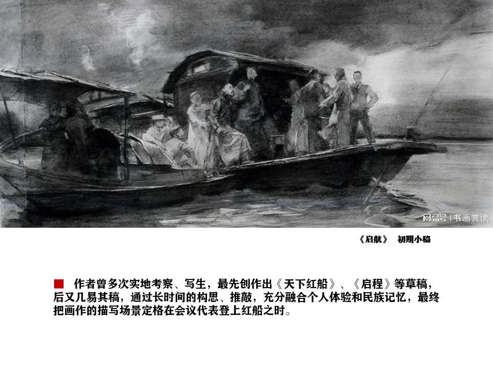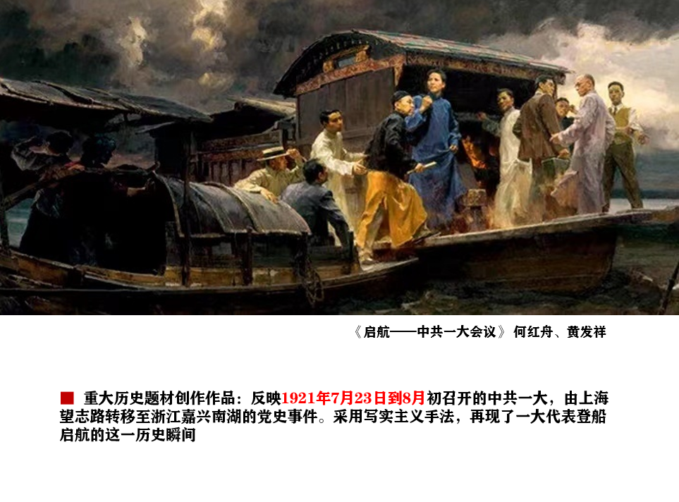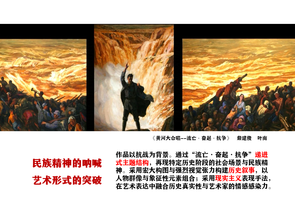 在经典作品赏析环节,结合毛泽东诗词与近现代经典美术作品,解读了主题性创作的思想性与艺术性。《启航》《苍山如海,残阳如血》《黄河大合唱》等经典美术作品,以现实主义手法为基,融合写实与表现性,将革命精神与民族情怀凝于笔墨,成为时代的精神印记。