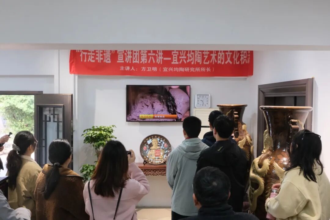 次日上午,师生首先走进宜兴市均陶研究所。宜兴均陶以“堆贴花”工艺为核心,被誉为“陶中瑰宝”。师生通过纪录片了解了均陶“十六指法”的千年传承脉络,在展厅中观摩了张丽、方薛斐等创作者的代表作品。国家级非遗传承人方卫明大师随后与师生面对面交流,详细讲解“堆花”“贴花”的技法。谈及手艺时,老先生的认真与执着令人动容。