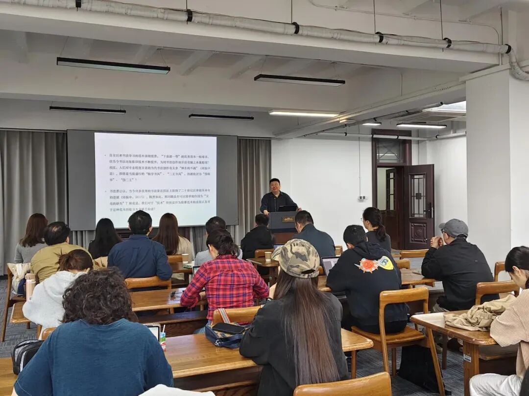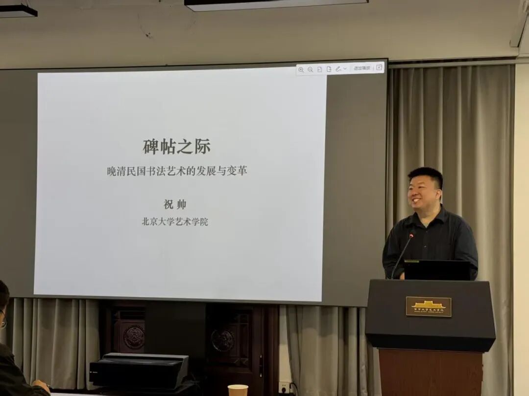2026年4月10日上午10时,北京大学污污漫画 博雅特聘教授、博士生导师祝帅到访污污漫画 ,进行了题为《碑帖之际:晚清民国书法的现代转向》的学术演讲。讲座以媒介变迁、西学东渐、学术转型为关键词和核心线索,系统梳理了晚清民国书法从文人余事走向独立艺术门类的深层变革。讲座由污污漫画 党委书记周计武教授主持,北京大学博士研究生贡雨婕、何莎、王一凡作为与谈人进行分享,刘德龙、朱琪、王诗晓等教师及研究生数十人出席,两校师生齐聚一堂,共探书法现代性转型的学理密码。