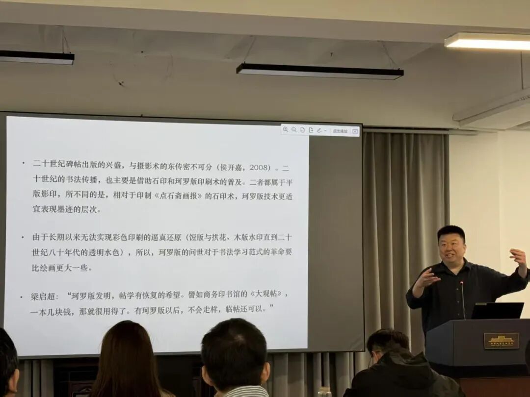 主持人周计武进行学术总结。他指出,本次讲座及与谈发言以跨媒介、思想史、全球化的视野,揭示了从宋代雕版印刷、晚清珂罗版到当代出版复制技术是如何全方位改变了传统书法的形态、技法、观念与审美的。他认为,在现代化进程中,书法被纳入西方艺术体系,获得独立身份,但也面临被图案化、设计化、视觉化的风险。真正的书法研究,既要知其变,更要识其常,看到书法不只是一门艺术,更是文化、思想与文明的精神同构,只有通“变”知“常”,才能回归书法之“本”。