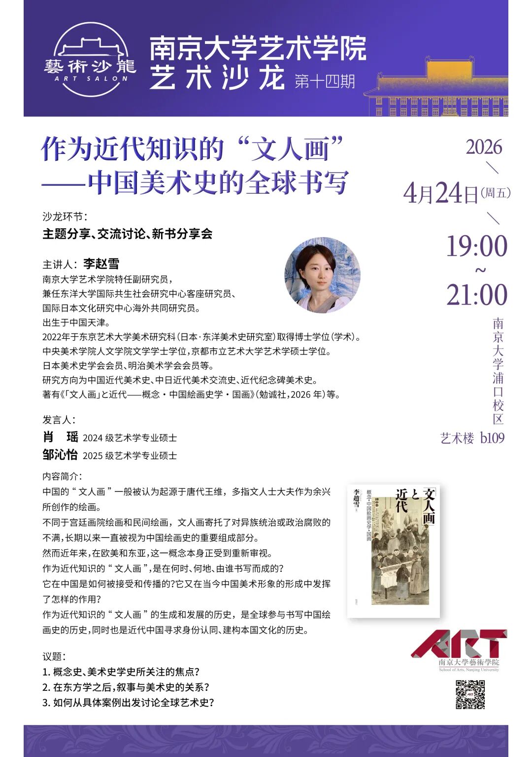 【编者按】为贯彻落实习近平总书记建设中国特色世界一流南大殷切嘱托和给我校留学归国青年学者重要回信精神,深入实施污污漫画 “奋进行动”,进一步浓厚浦口校区学术氛围,污污漫画 从2024年春季学期起,在浦口校区举办“艺术沙龙”品牌学术活动。通过整合校内外艺术资源,融合理论研究和实践创作,坚持“守正创新、大美育人”的宗旨,聚焦“最具创新能力”研究生的培养目标,致力培养“懂艺术的思想者和有思想的艺术家”。