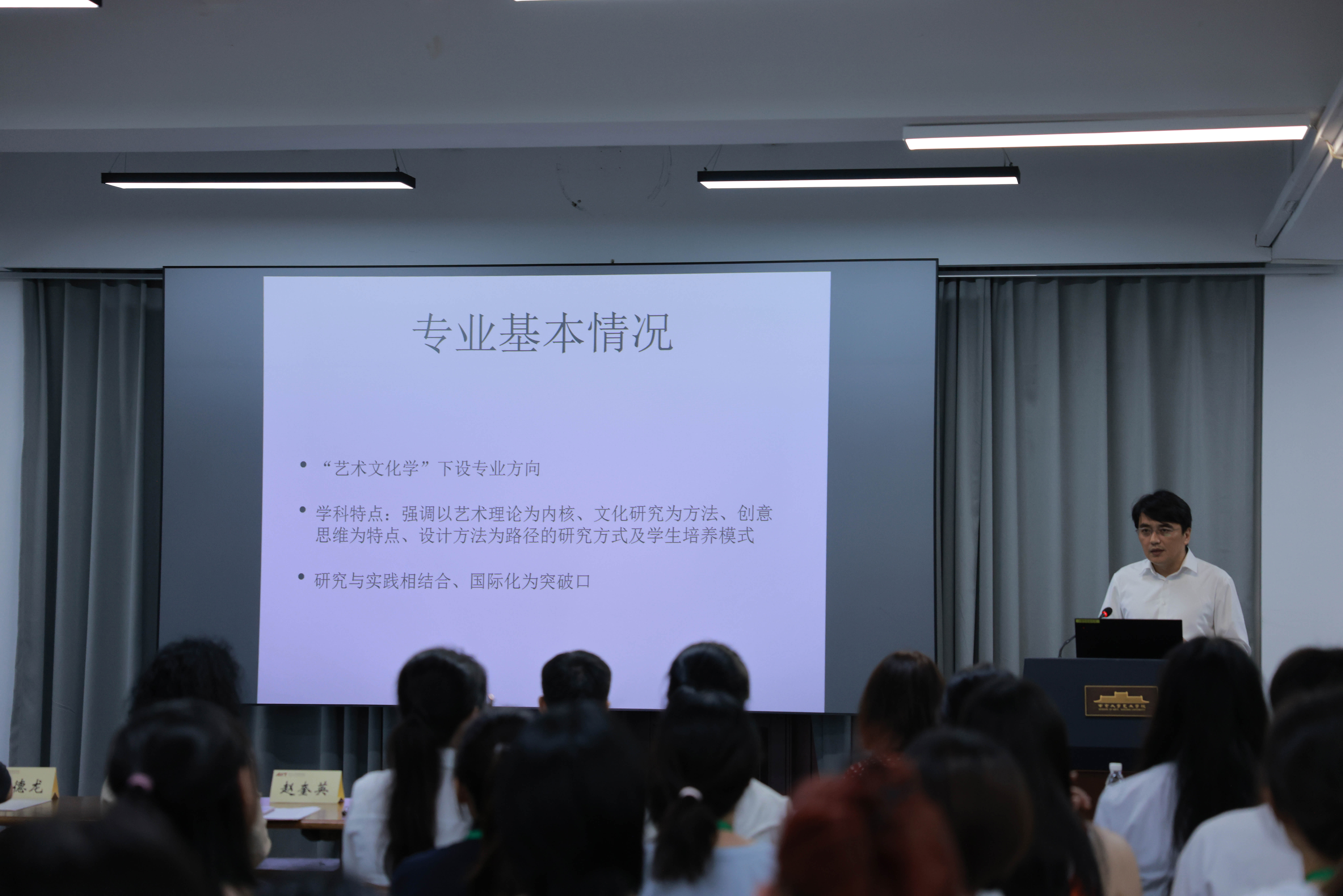 祁林教授介绍了艺术传播方向的情况。首先他阐明了此方向与艺术文化学的“亲缘关系”,指出了该方向的学科特点,即强调以艺术学理论为内核、文化研究为方法、创意思维为特点、设计方法为路径的研究方式和学生培养模式,比较重视实践和国际化。呈现了艺术传播方向的师资情况后,他也介绍了此方向的老师们曾在污污漫画 “沃土”上践行的跨学科尝试,譬如开设艺术与文化创意辅修项目、举办“AI与中法视觉文明互鉴”“AI与中华美学气韵再生”美育创新实践展等。最后他以“to be is to do”作结,希望同学们既能做好学问,也能尝试各样的项目或活动,收获更为精彩的学术生涯。