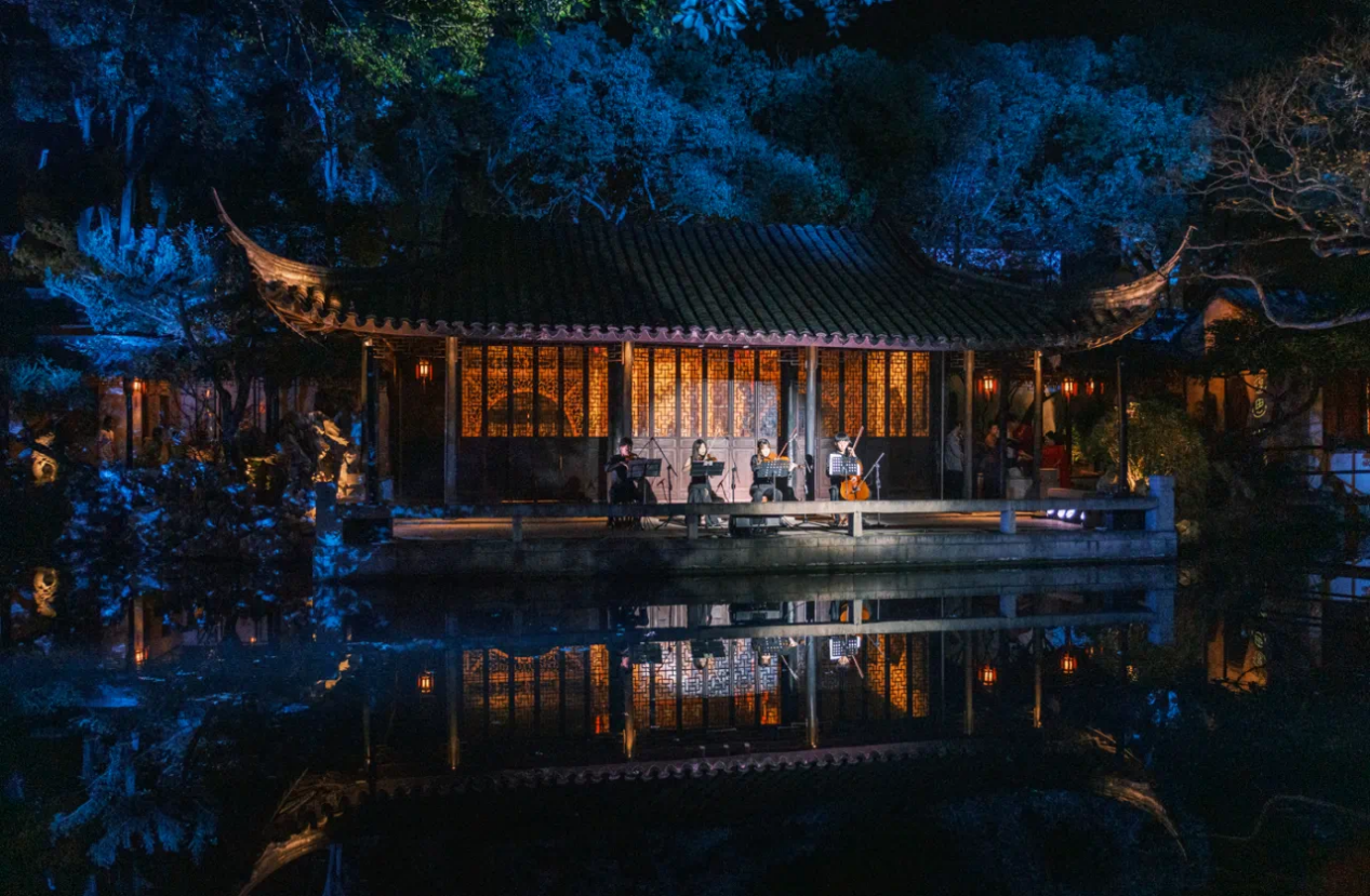 当日晚19:30青春时光”青年艺术家展演在同里退思园拉开帷幕。青年艺术家们于建筑、文学、戏剧、书画、哲学、山水自然间,共赴一场如梦如幻的视听盛宴。精妙的舞美让观众沉浸式地感受江南文化的魅力,传统与现代、戏曲与建筑的融合,以青春为题,刻画江南园林新的“灯火阑珊”。青年艺术家作品展演以音乐、舞蹈、戏曲等形式给予了动态的沉浸式体验,呈现出江苏省青年艺术家们在新时代融合新创意的创造潜力。